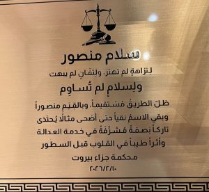 لمناسبة إحالتها على التقاعد، أقيم حفل تكريمي وداعي على شرف رئيسة قلم محكمة الدرجة الأولى الجزائية في بيروت السيّدة سلام منصور جابر التي عرفت بمناقبيتها وحسّها الإنساني ورقيها ونزاهتها ومحبّتها للجميع وأحبّها الجميع من قضاة وموظّفين ومحامين ومتقاضين وصحفيين معتمدين في عدلية بيروت.